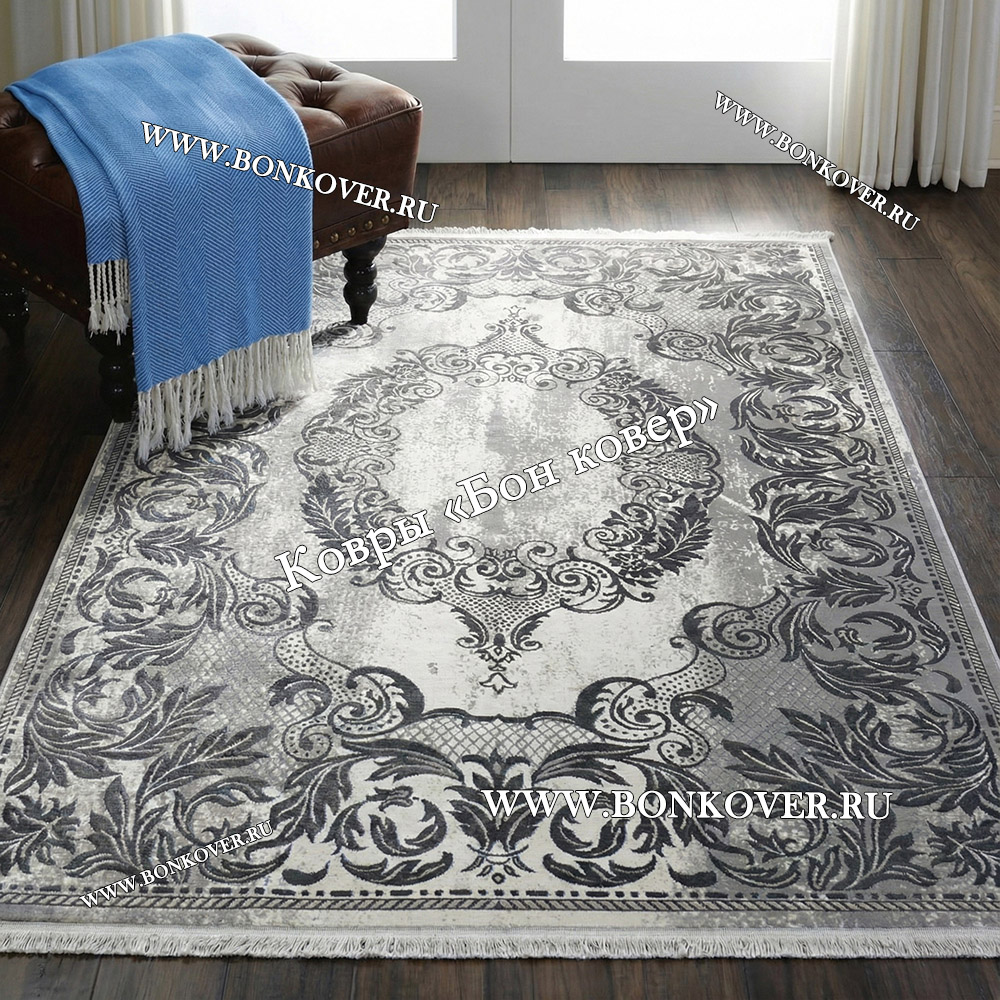Красивый Ковер Для Гостиной Медальон Дизайн 30544 Серый наполняет интерьер комнаты теплом и уютом, гармонично сочетает в себе изящество и стиль. Он соткан из современных материалов, прочный и долговечный.